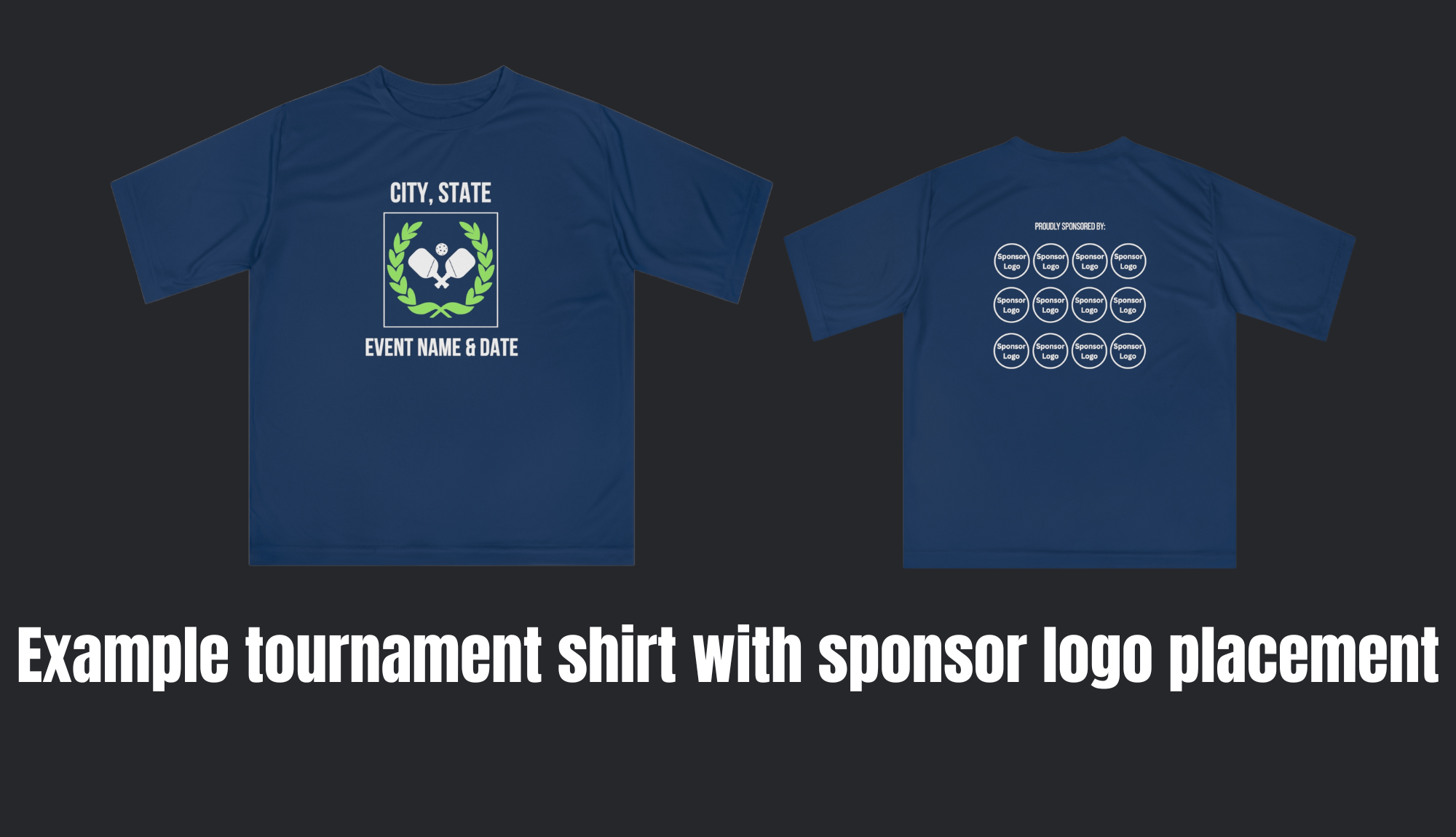 Shirts can be customized with: Shirt color options, your event logo, one of our pre-made tournament designs, front and/or back printing, Sponsor logos are optional, shirt styles (including t-shirts, long sleeves, or sweatshirts)